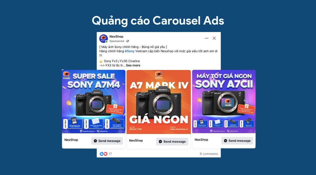 Dịch vụ Marketing Facebook quảng cáo Carousel Ads hỗ trợ doanh nghiệp hiển thị nhiều hình ảnh trong một bài viết. Với Carousel Ads, doanh nghiệp có thể dễ dàng trưng bày nhiều sản phẩm cùng lúc.